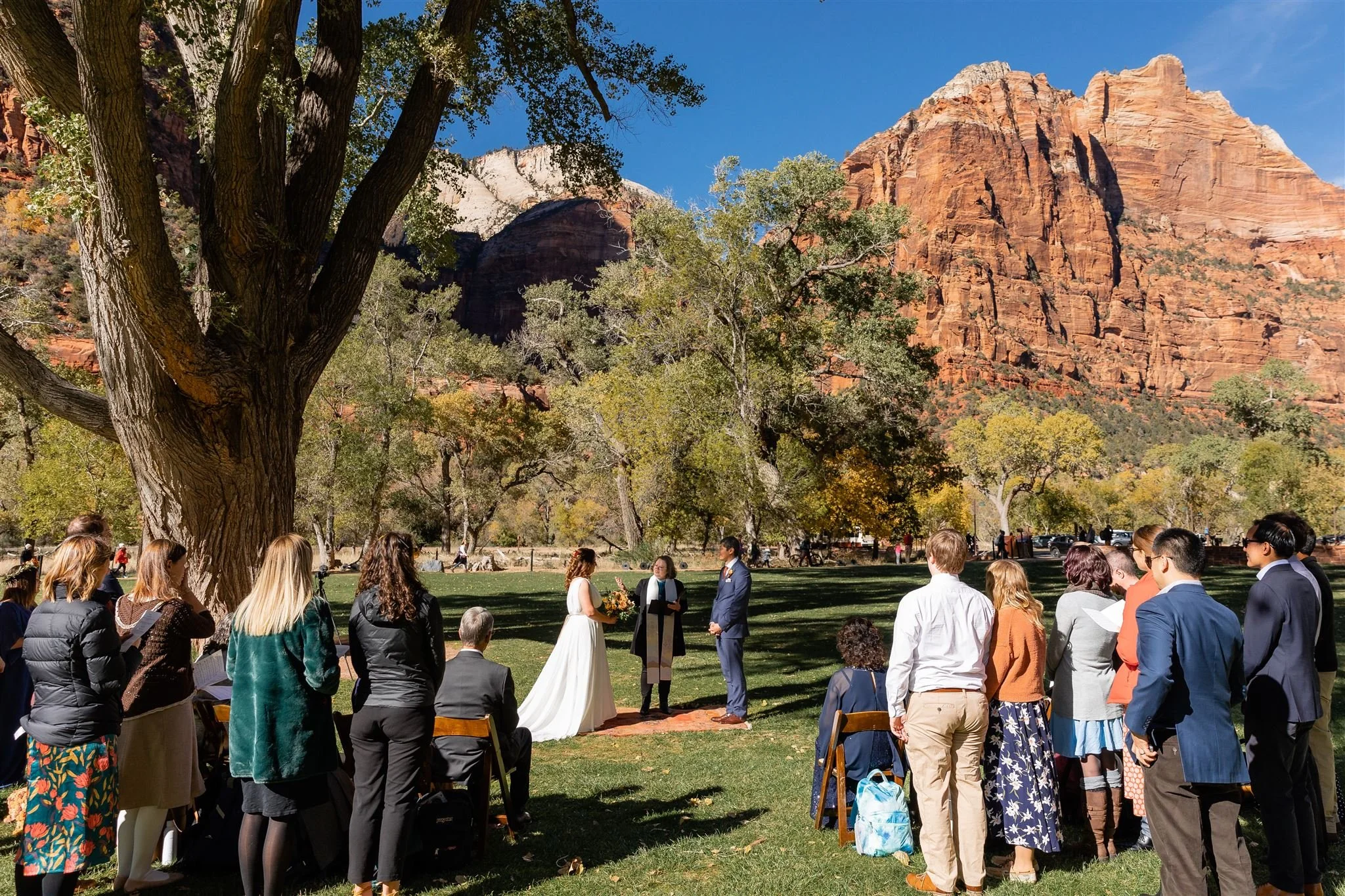 The Zion Lodge Lawn, surrounded by towering sandstone cliffs and majestic cottonwood trees, offers a breathtaking backdrop for a wedding ceremony. This location is ideal for couples who want to get married inside the National Park with a larger group and also want amenities close by. It's not an ideal location for couples who want privacy and those who don't want to stay at the Lodge. If you're researching which wedding location in Zion National Park is right for you, read on for the ultimate guide to planning a Zion Lodge Lawn wedding from a local!