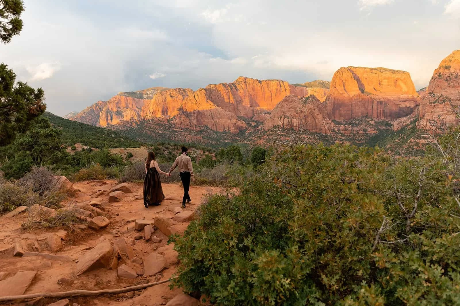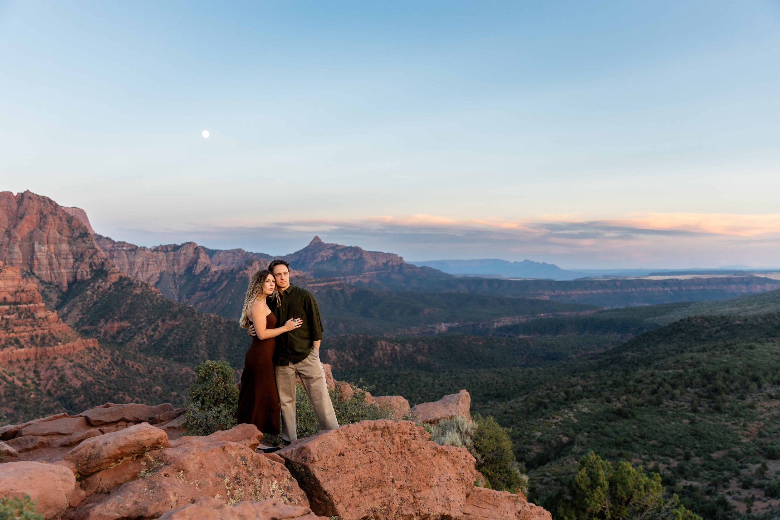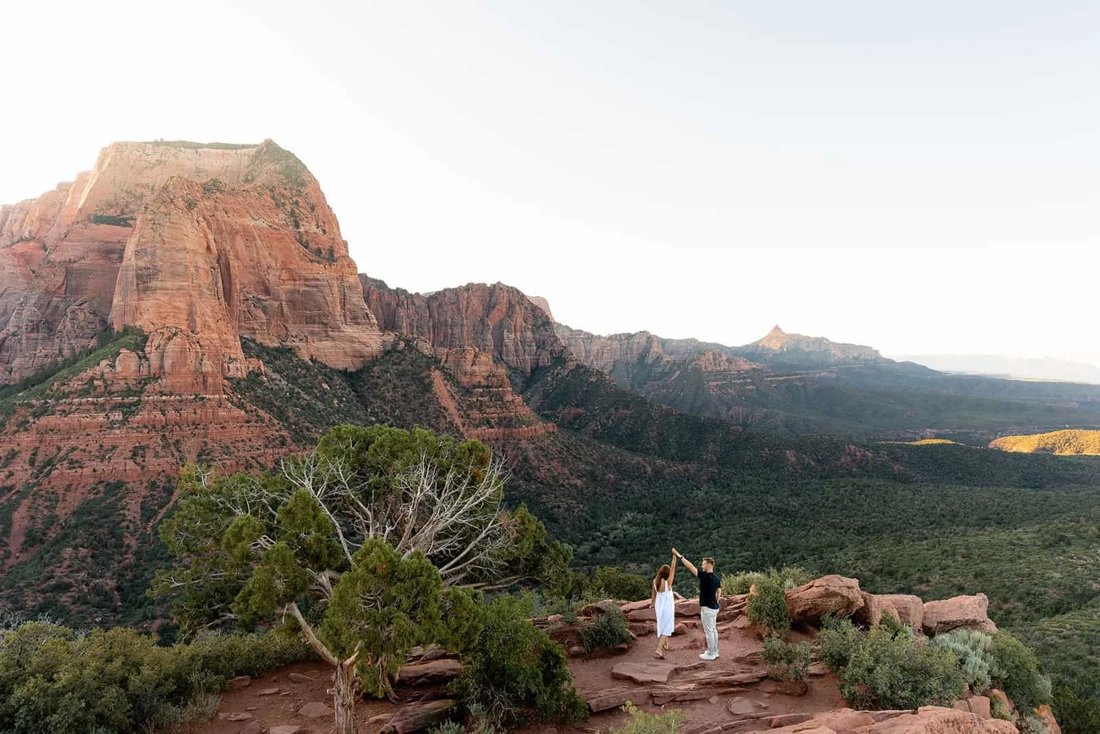 Like other parts of the Park, the absolute best time of day for photos at Timber Creek Overlook is right around either sunrise or sunset. During sunrise, the sun comes up from behind the canyons, often causing light streaks through the canyons and providing dreamy backlighting. During sunset, the red sandstone peaks light up and glow with deeper saturation as the sun dips below the Pine Valley Mountains. If you're planning to have your ceremony at Timber Creek Overlook but you want to prioritize the best light for other locations nearby, then you may want to consider a mid-afternoon ceremony when the light will be more direct on the canyons. In general, we do not recommend late morning or high noon ceremonies. This time of day presents the least flattering light for photos.