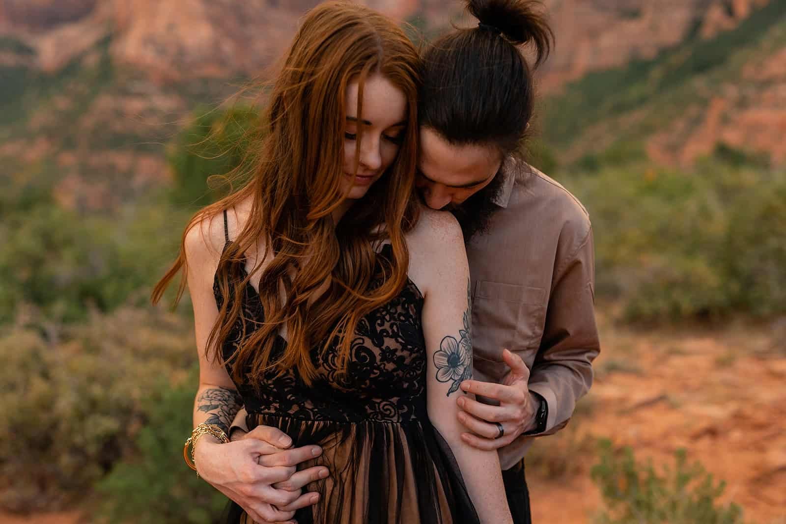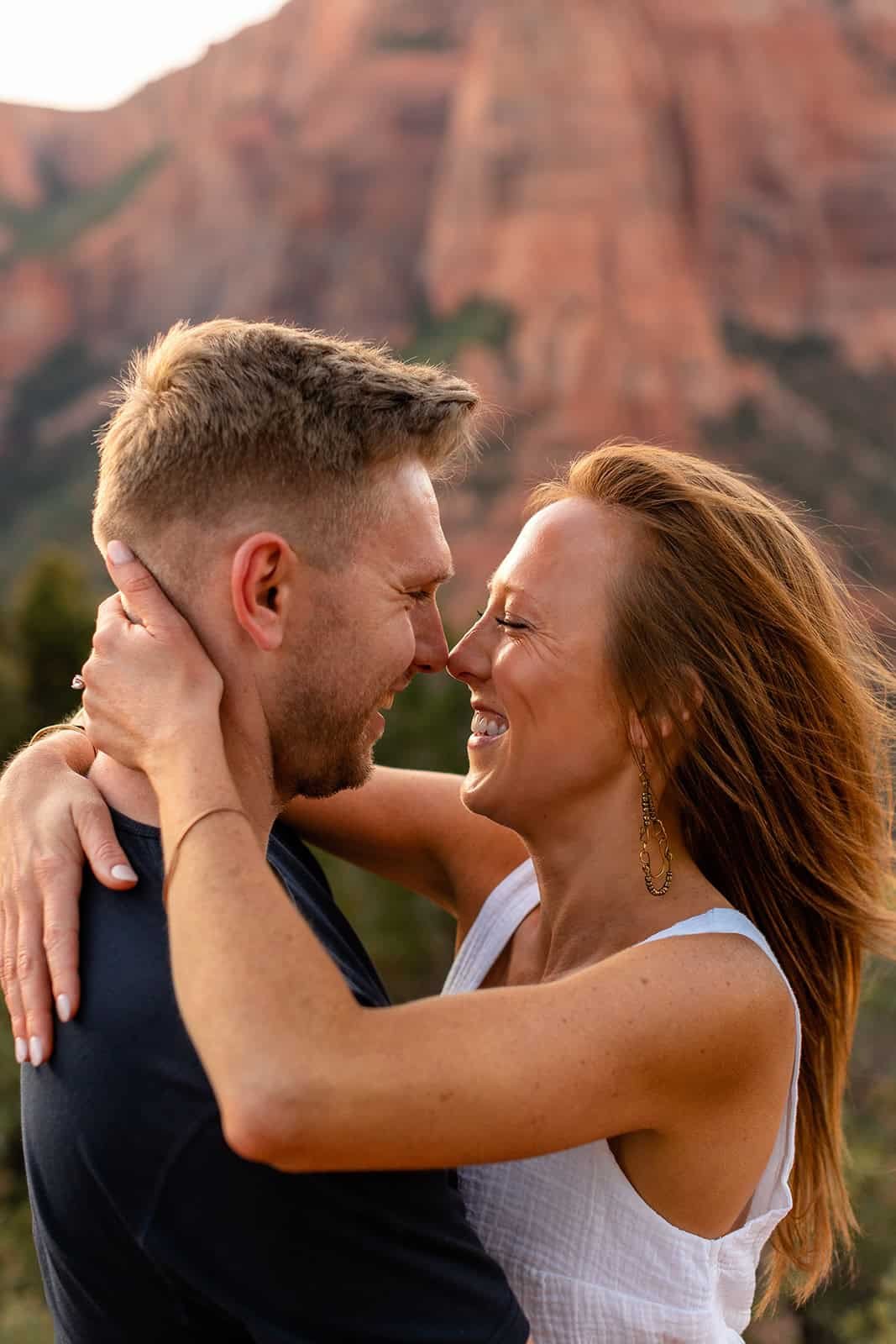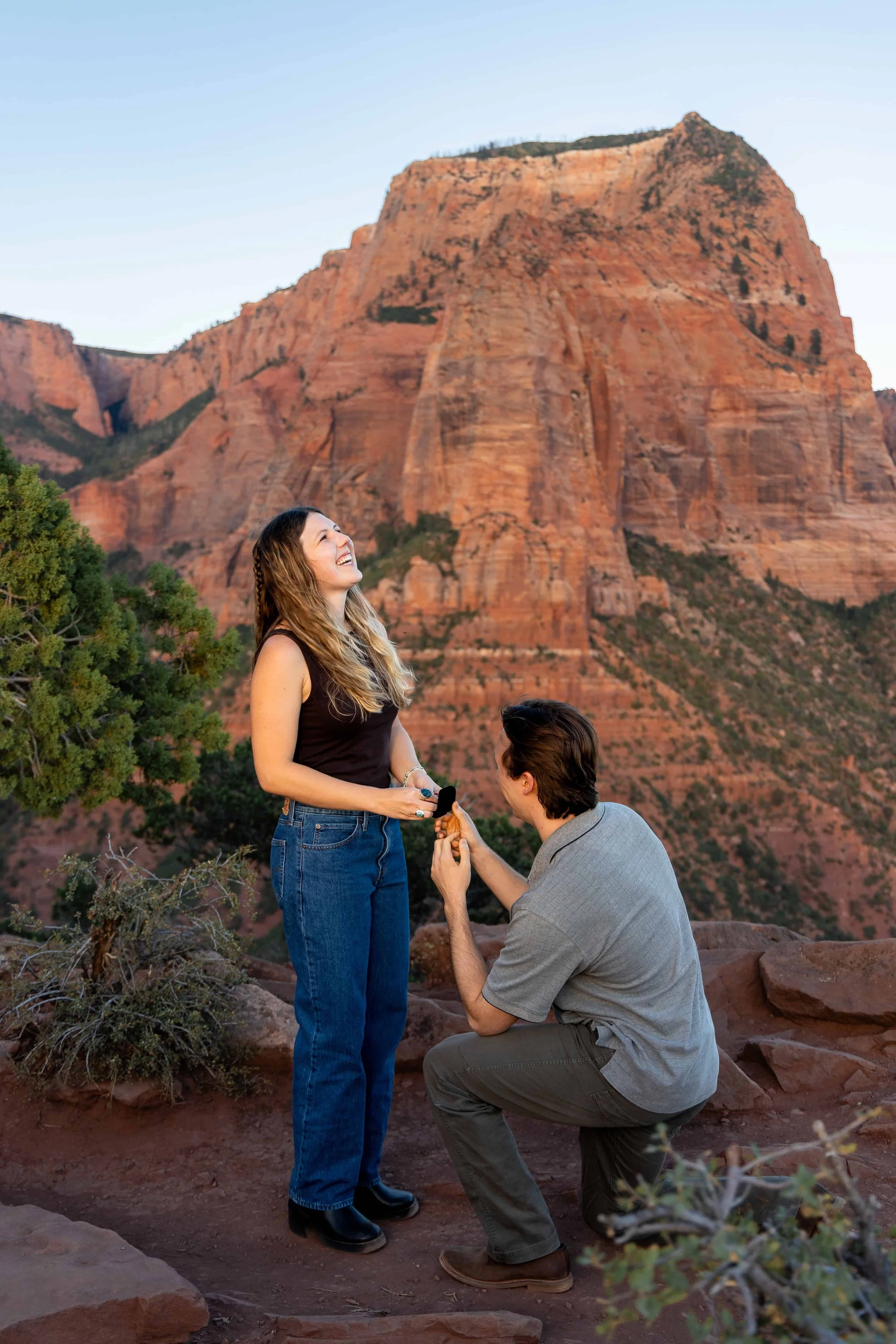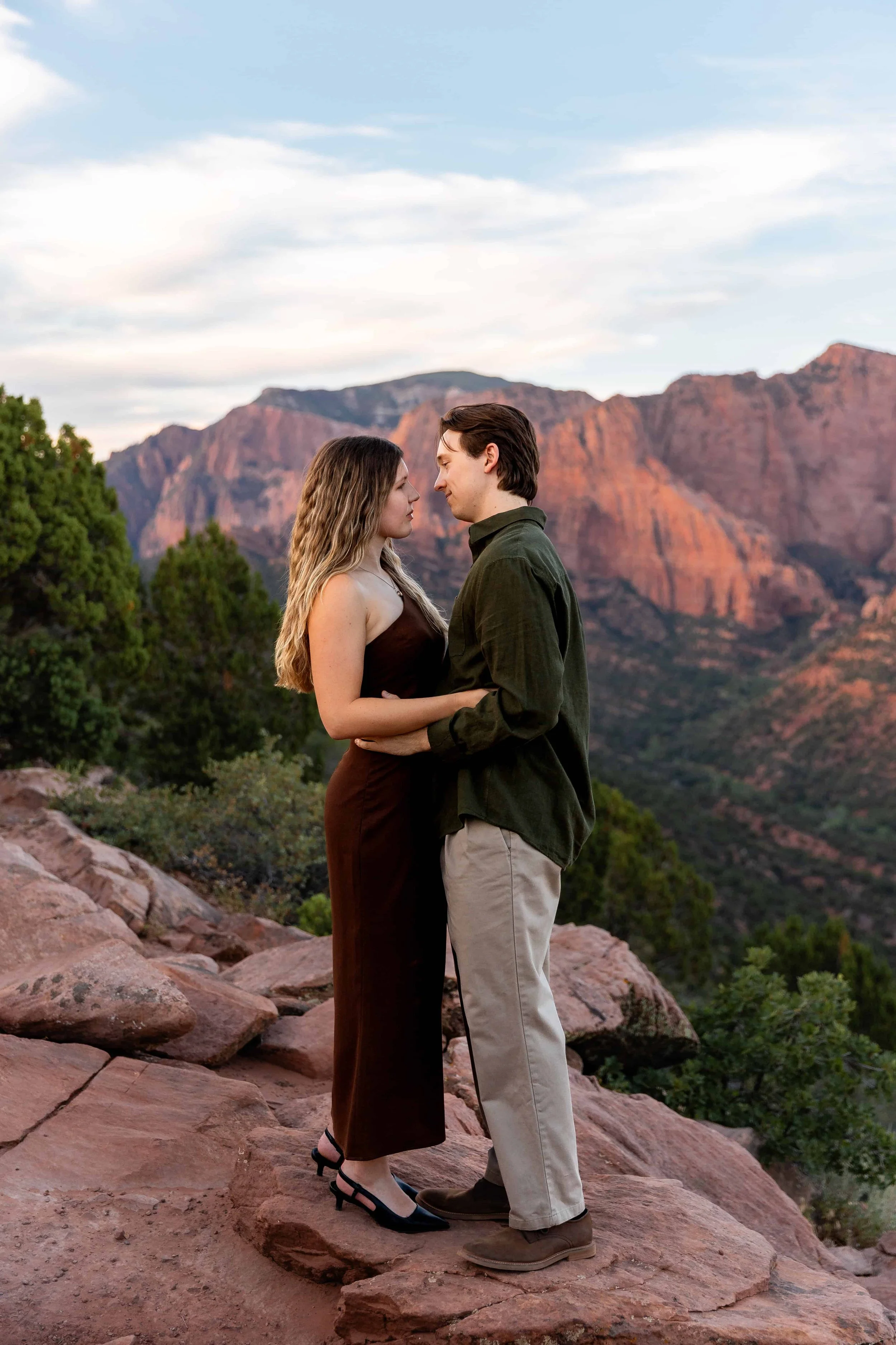 Like other parts of the Park, the absolute best time of day for photos at Timber Creek Overlook is right around either sunrise or sunset. During sunrise, the sun comes up from behind the canyons, often causing light streaks through the canyons and providing dreamy backlighting. During sunset, the red sandstone peaks light up and glow with deeper saturation as the sun dips below the Pine Valley Mountains. If you're planning to have your ceremony at Timber Creek Overlook but you want to prioritize the best light for other locations nearby, then you may want to consider a mid-afternoon ceremony when the light will be more direct on the canyons. In general, we do not recommend late morning or high noon ceremonies. This time of day presents the least flattering light for photos.