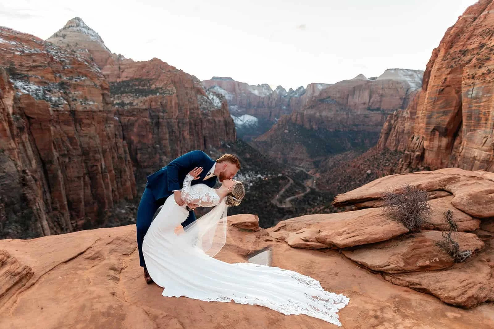 Many people are familiar with the blistering heat of Zion's summer busy season, but did you know Zion stays open year round and is a great place to visit in the winter? Zion boasts incredible views year round, but be prepared to have your breath taken away when you see the snow contrasting along the cracks of the tower red rock walls of the canyon. With some preparation, you can experience all the beauty Zion has to offer while avoiding the crowds. Read on for tips on having a Zion National Park wedding in the winter!