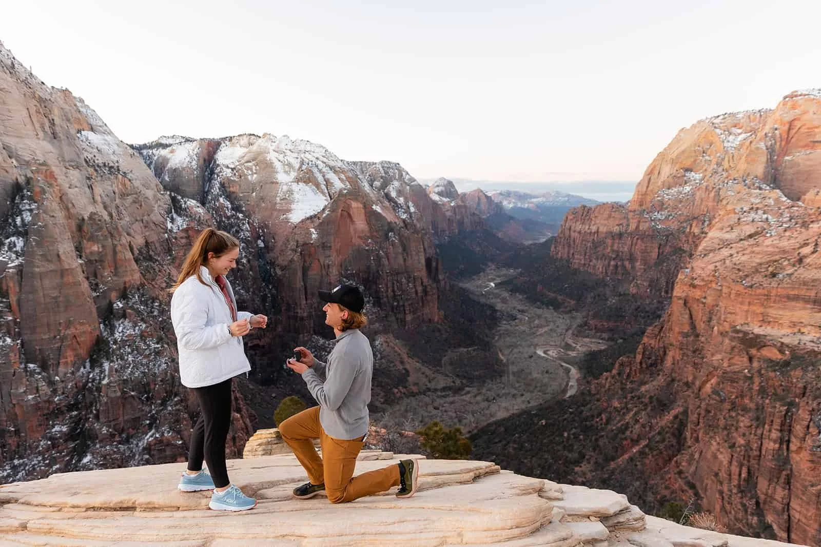 We highly recommend choosing warm footwear that also provides good traction. Most of the terrain in Zion is uneven and already requires good traction to navigate, that's even more important when the trails could have icy patches. We recommend looking into some stylish winter boots that will look nice with your outfit and also keep you warm. Make sure you try the boots on with your dress or suit to make sure they play nice together!